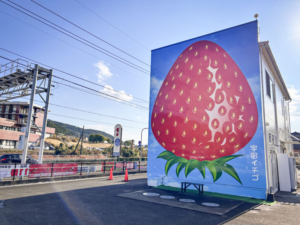 伊万里市内から有田・佐世保方面へ向かう時に、いつも目に止まっていた(入らないわけがない)この巨大なイチゴが描かれた壁!