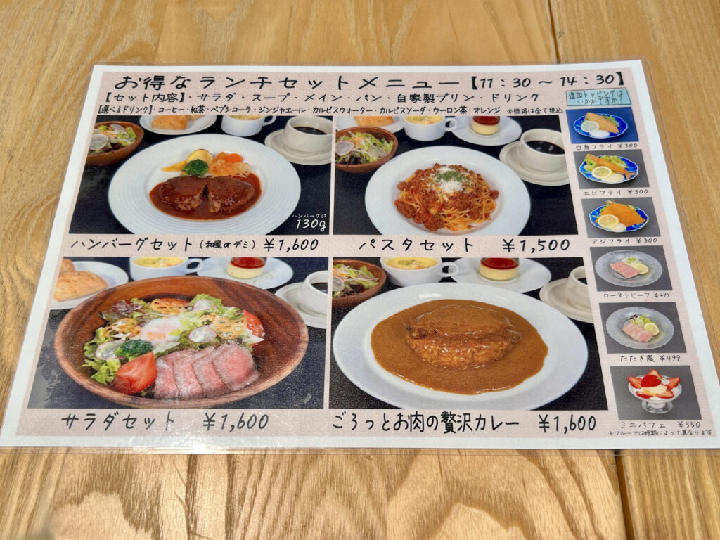 こちらは、単品が1,780円(税込)で、プリン・ドリンク付きは2,000円(税込)でした。