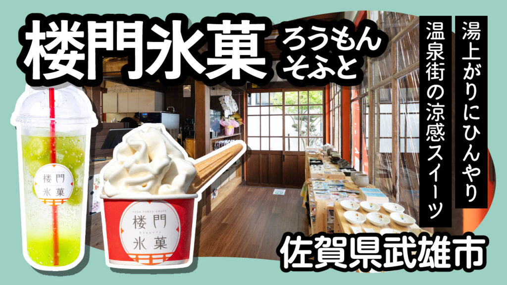 1本目は、武雄市・武雄温泉新館 1Fにあるテイクアウト専門「楼門氷菓(ろうもんそふと)」さんの店舗紹介動画です。