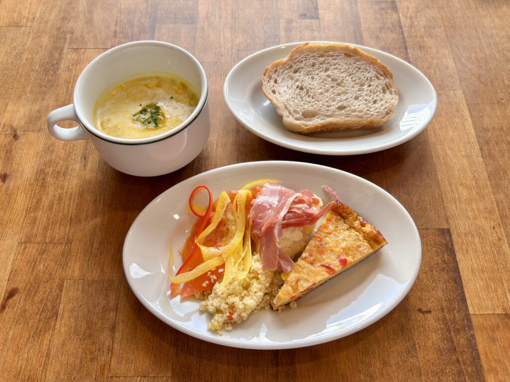 メインがパスタで、スープ or ポタージュ、前菜盛り、パンがつきます。
