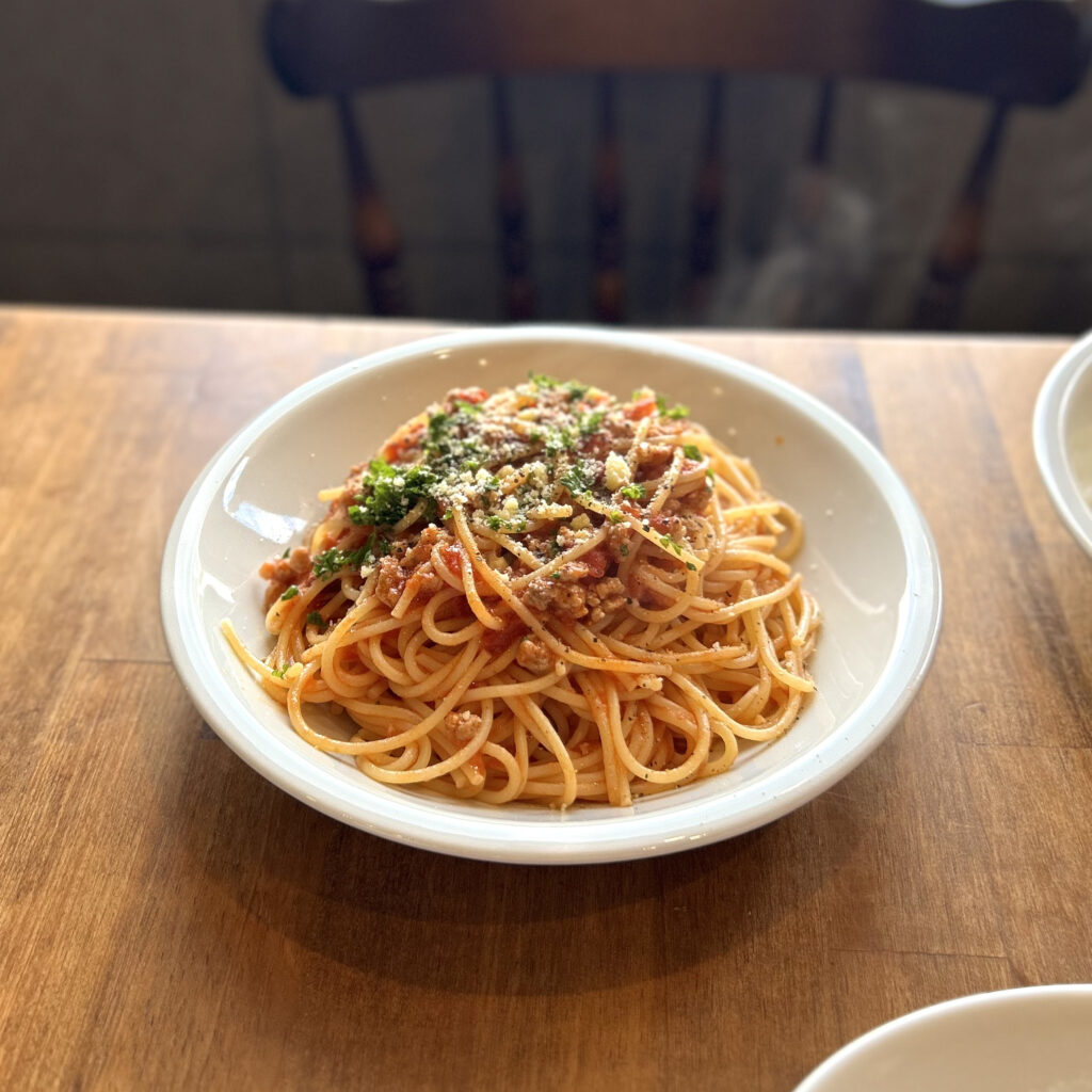 酸味のあるトマトに唐辛子の辛さ、ミートソースとはまた違う肉肉しさがあって、満足感たっぷりの一皿でした。