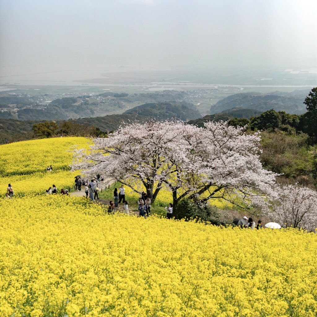 ここからは、手前に広がる菜の花や桜、その奥に広がる諫早湾干拓と有明海、
