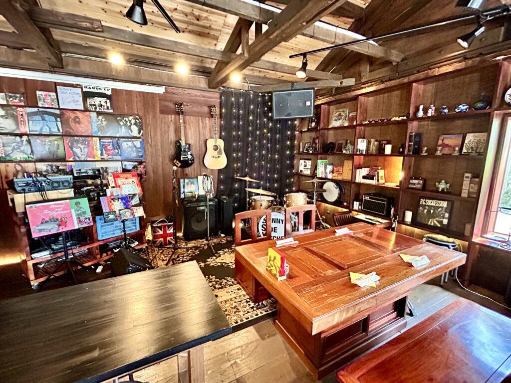 さらに奥にはドラムセットやギター、レコードがあります。