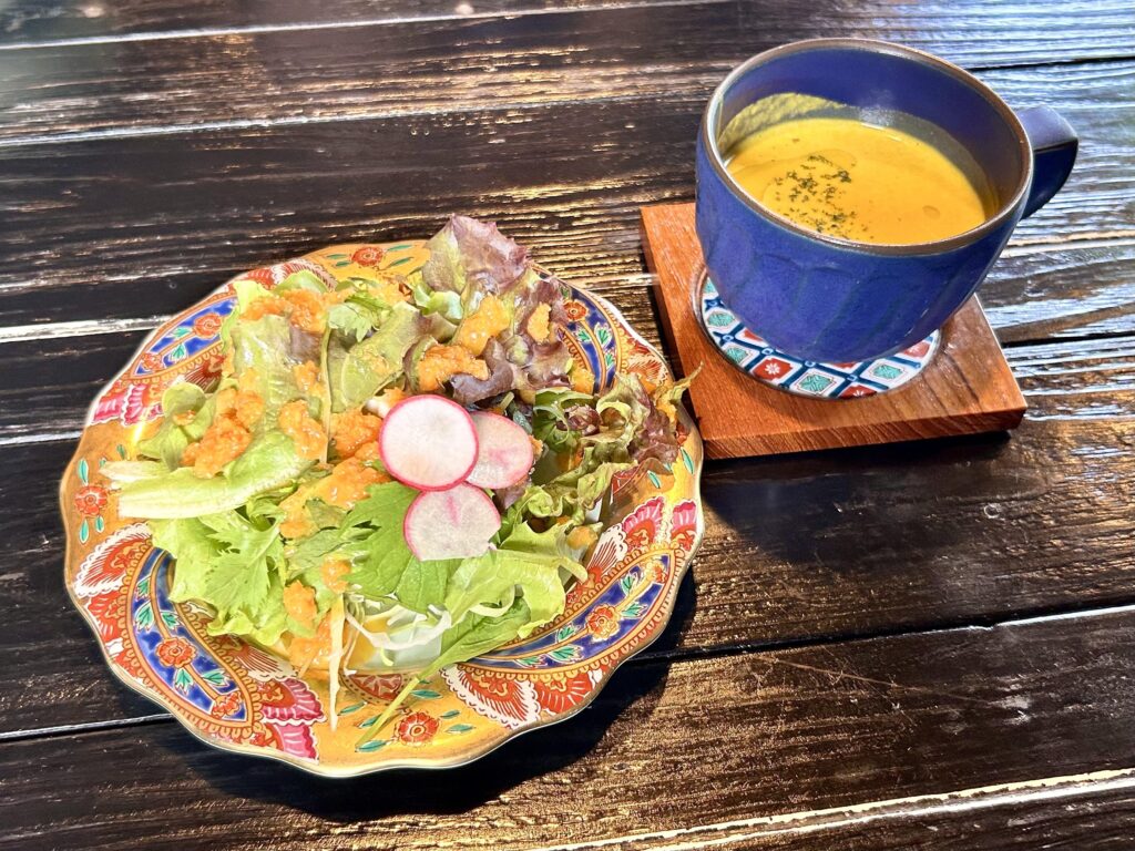 かぼちゃスープ(この日だけだったそう)にサラダのドレッシングも美味しくて、大満足!