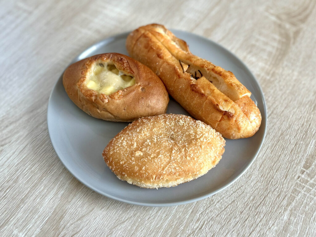 手前:カレーパン、左上:くるみチーズ、右上:明太フランス。