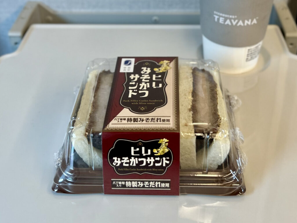 せっかくなので、遅めの朝ご飯も兼ねて、味噌カツサンドを買い、新幹線内でいただきました。